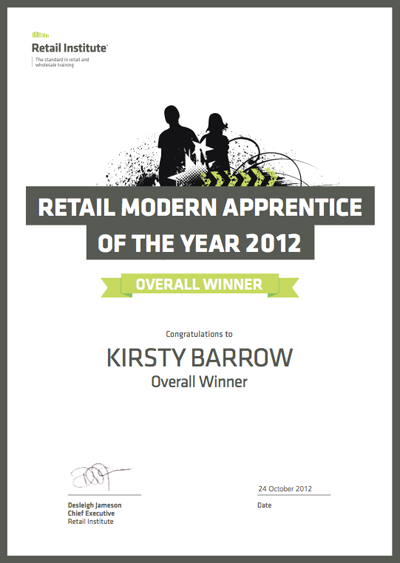 Collateral for Retail Institute's annual Retail Modern Apprentice of the Year 2012 Awards. Included: entry form design, web graphics, stickers, badges, emails, certificates and powerpoint presentations.